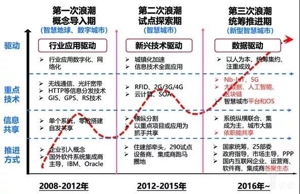 2016年之后,國家提出新型智慧城市概念,強調(diào)以數(shù)據(jù)為驅(qū)動,以人為本、統(tǒng)籌集約、注重實效,重點技術(shù)包括Nb-IoT、5G、大數(shù)據(jù)、人工智能、區(qū)塊鏈、智慧城市平臺和操作系統(tǒng)等,信息系統(tǒng)向橫縱聯(lián)合大系統(tǒng)方向演變,信息共享方式從運動式向依職能共享轉(zhuǎn)變。推進(jìn)方式上逐步形成政府指導(dǎo)、市場主導(dǎo)的格局,政府方面25個國家部委全面統(tǒng)籌,市場方面電信運營商、軟件商、集成商、互聯(lián)網(wǎng)企業(yè)各聚生態(tài)。