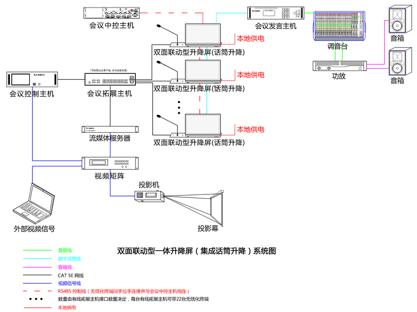 3、系統(tǒng)可以擴(kuò)展第三方網(wǎng)絡(luò)中控,從而實(shí)現(xiàn)任意會議終端(經(jīng)過授權(quán))隨時對周邊設(shè)備進(jìn)行控制;第三方中控可通過RF/RS 485協(xié)議對升降進(jìn)行統(tǒng)一控制。