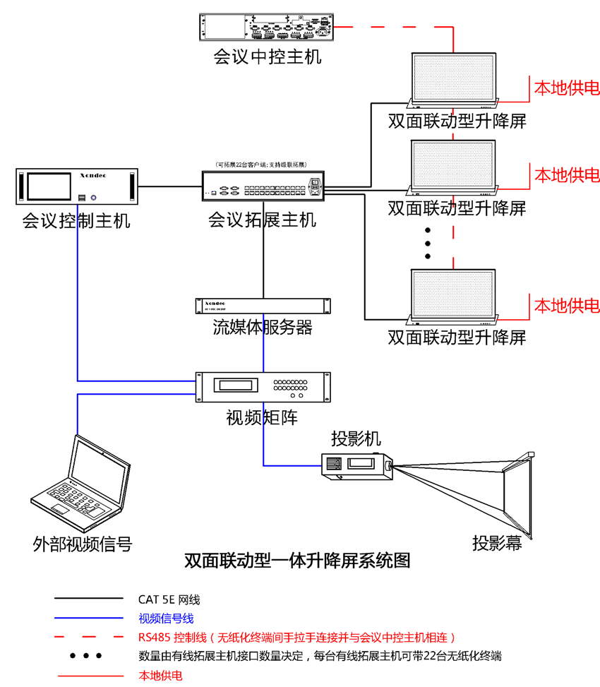3、系統(tǒng)可以擴(kuò)展第三方網(wǎng)絡(luò)中控,從而實現(xiàn)任意會議終端(經(jīng)過授權(quán))隨時對周邊設(shè)備進(jìn)行控制;第三方中控可通過RF/RS 485協(xié)議對升降進(jìn)行統(tǒng)一控制。