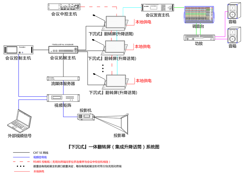 9、發(fā)言系統(tǒng)通過(guò)手拉手連接,通過(guò)專用音頻線連接至發(fā)言會(huì)議主機(jī)10、可接入VGA、DVI及HDMI模擬信號(hào),三者之間可手動(dòng)切換,亦可RS485統(tǒng)一切換。